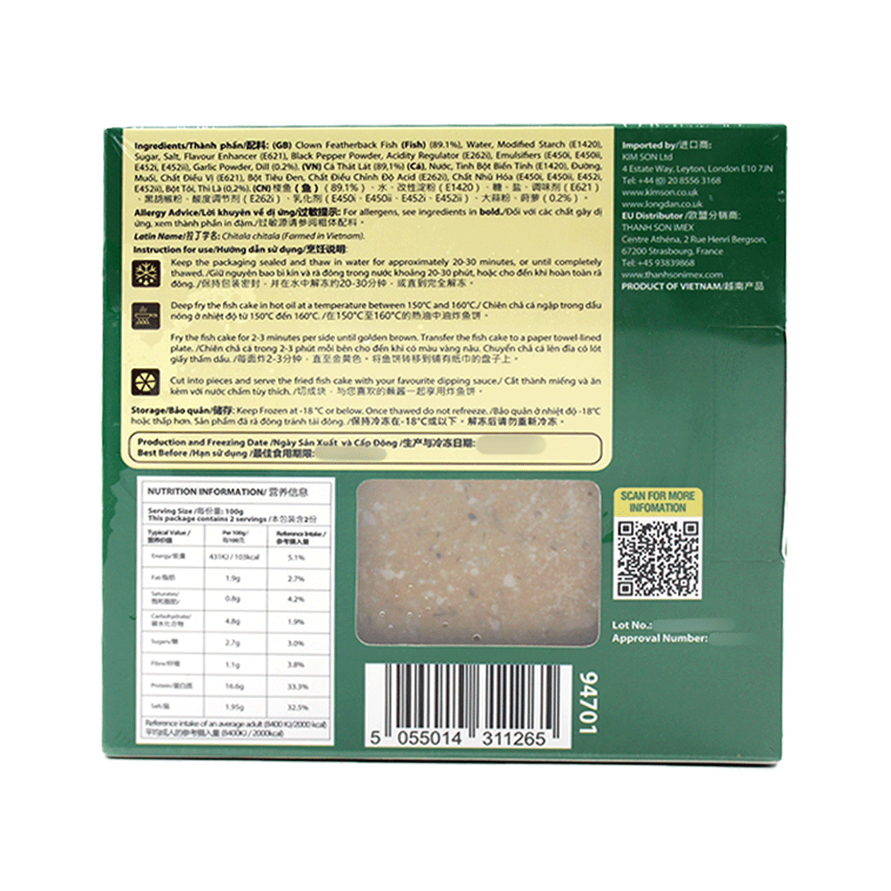 Ingredients List: Clown Featherback Fish (Fish) (89.1%), Water, Modified Starch (E1420), Sugar, Salt, Flavour Enhancer (E621), Black Pepper Powder, Acidity Regulator (E262I), Emulsifiers (E450I, E450Ii, E452I, E452Ii), Garlic Powder, Dill (0.2%).