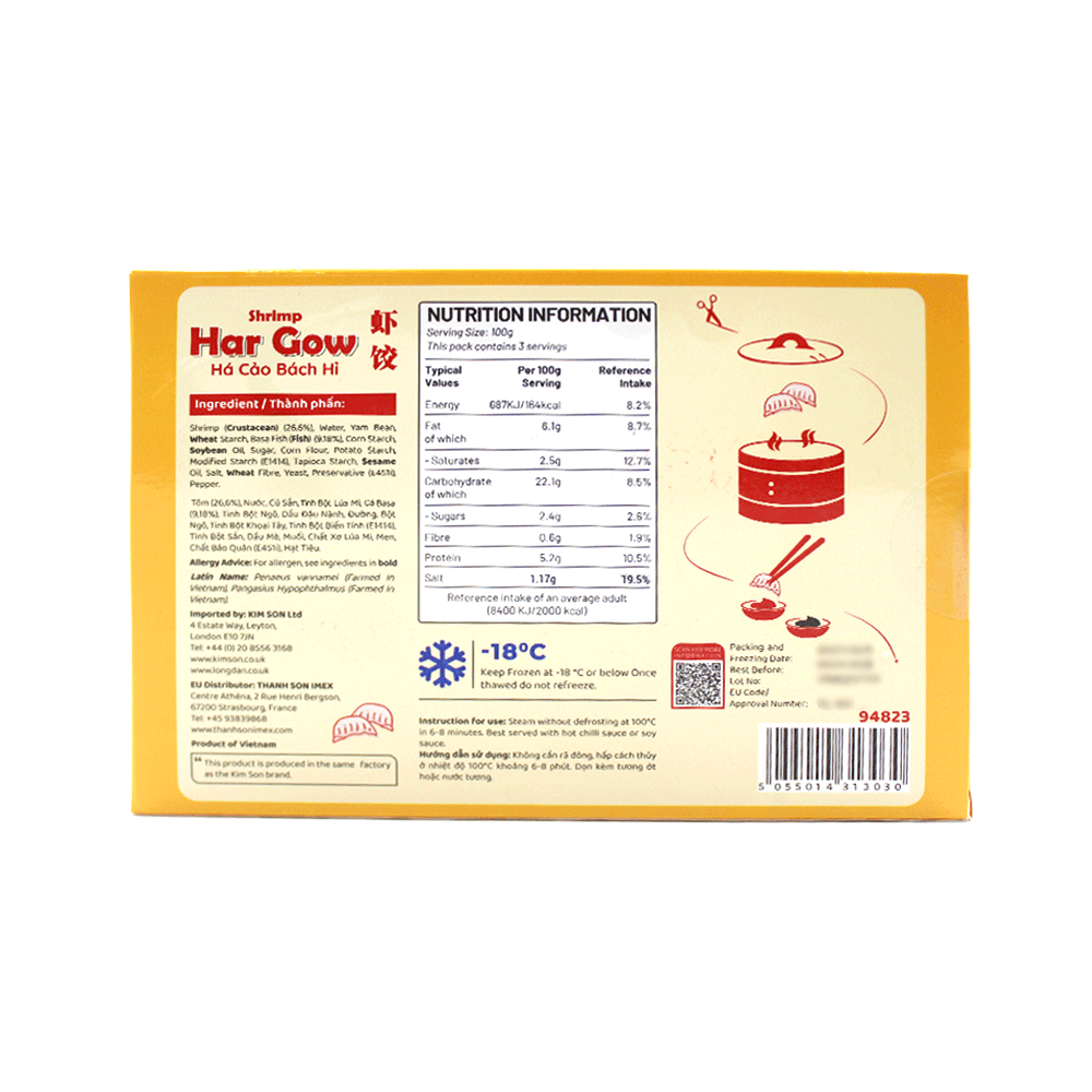 Ingredients List: Shrimp (Crustaceans) (26.6%), Sesame Oil, Surimi (Fish) (9.18%), Soybean Oil, Yam Bean, Wheat Fibre, Modified Starch (E1414), Salt, Sugar, Yeast, White Pepper, Stabiliser (E451I), Corn Starch, Wheat Flour, Corn Flour, Potato Starch, Tapioca Starch, Water.