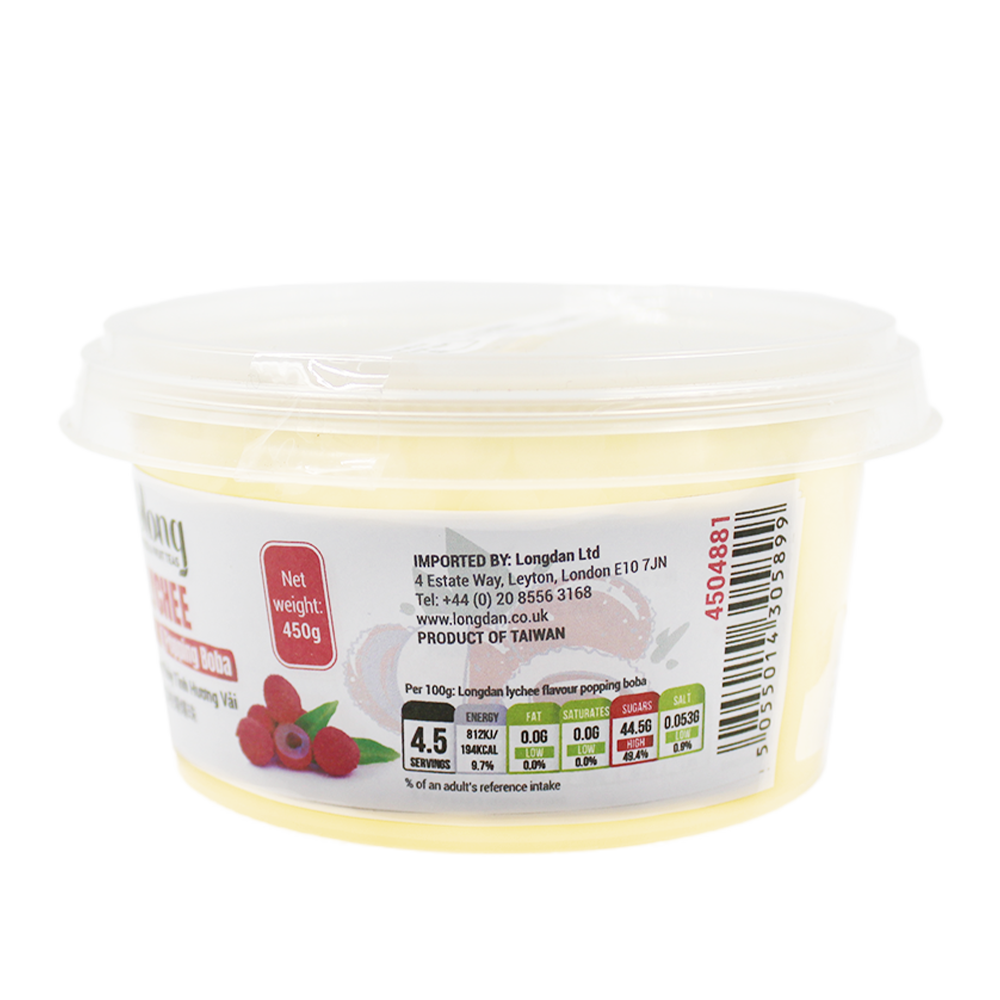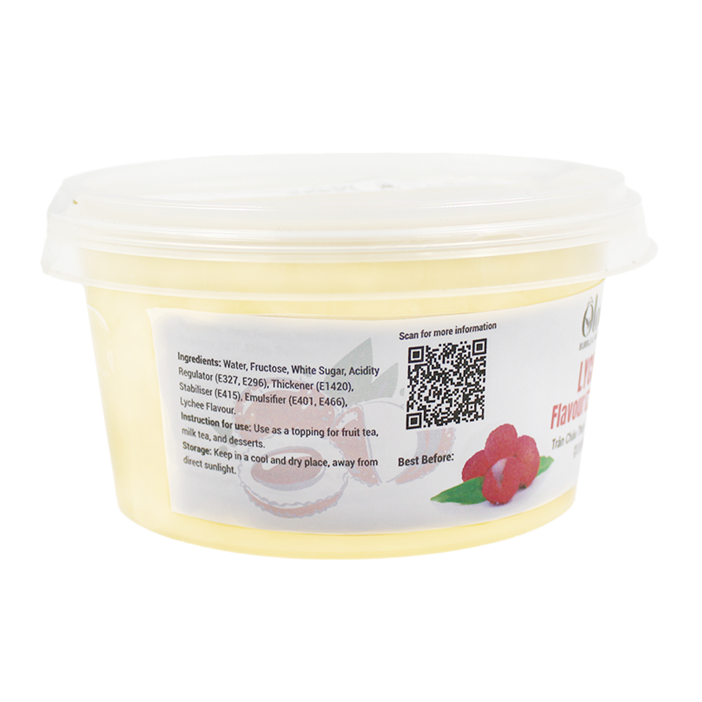 Ingredients List: Water, Fructose, Thickener (E1420), Stabiliser (E327), Acidity Regulators (E330, E296), Raising Agent (E401), Emulsifiers (E415, E466), Lychee Flavour (0.12%), Preservatives (E509, E202), Sweetener (E955*).