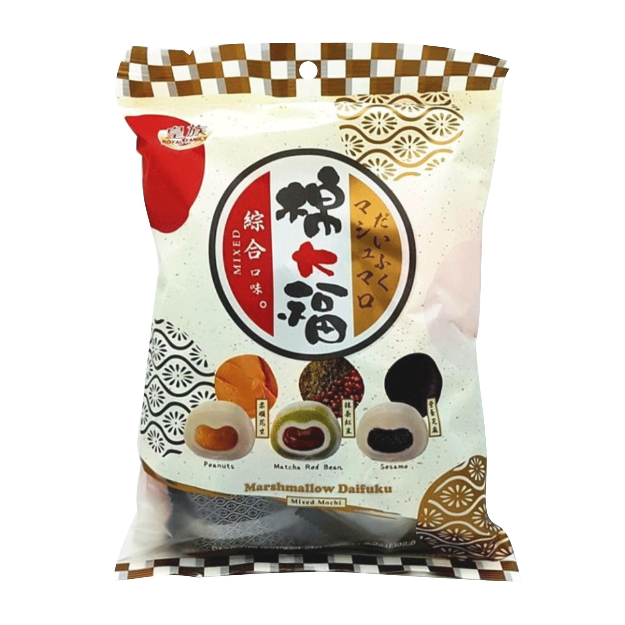 Peanut Mochi: Maltose, Sugar, Glutinous Rice (17.68%), Thickener (E1442), Trehalose, Peanut Butter (Peanut, Sugar, Vegetable Oil (Palm Oil, Rapeseed Oil), Salt, Peanut Flavouring) (9.3%), Gelatine (Beef), Palm Oil, Emulsifier (E471), Preservative (E202).