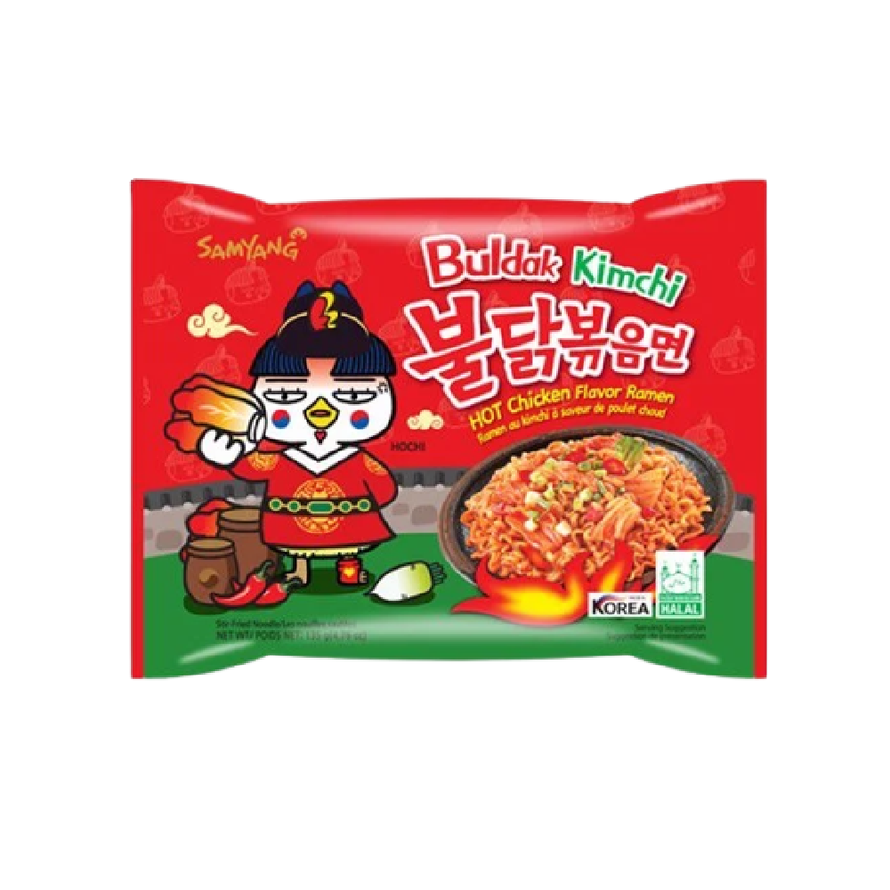 Ingredients List: Noodle (74.3%): Wheat Flour, Modified Tapioca Starch, Refined Palm Oil, Wheat Gluten, Refined Salt, Emulsifier [Soy Lecithin (E322)], Acidity Regulator [Potassium Carbonate (E501(I)), Sodium Carbonate (E500(I)), Sodium Phosphate Dibasic (E339(Ii)), Citric Acid (E330)], Thickener [Guar Gum (E412)], Green Tea Flavour Oil. Soup (23.7%): Water, White Sugar, Kimchi Powder, Artificial Chicken Flavour, Corn Syrup, Soybean Oil, Red Pepper Paste, Chilli Pepper Power, Soy Sauce, Onion, Artificial Chicken Flavour Powder, Flavour Enhancer [Monosodium L-Glutamate (E621)], Red Pepper Powder, Garlic, Modified Potato Starch, Paprika Extract, Decolourised Chilli Extract, Colour [Caramel Powder (E150C)], Black Pepper Powder, Acidity Regulator [El-Malic Acid (E296)] Flake (2.0%): Dried Kimchi Flakes. Contains: Wheat, Gluten, Soy.