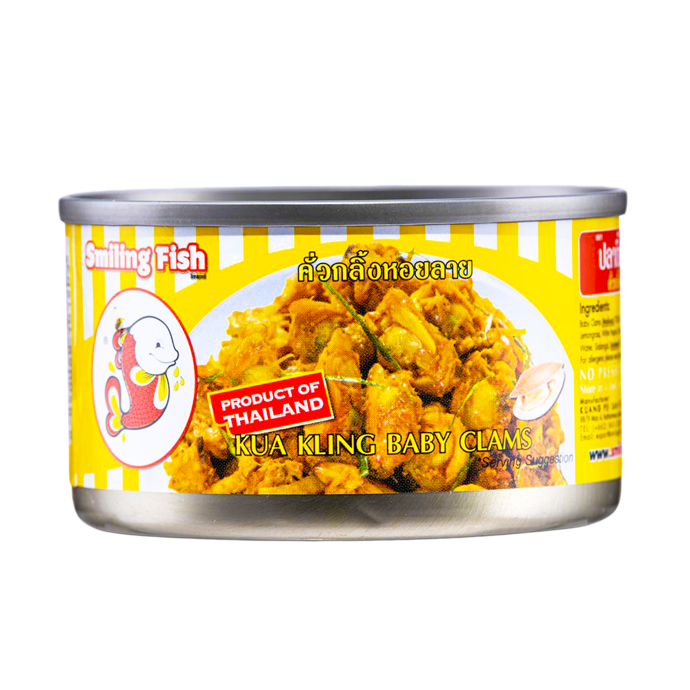 Ingredients List: Baby Clams (Molluscs) (70%, Kua Kling Curry Paste (Chilli, Garlic, Lemongrass, White Pepper, Turmeric, Coriander Seed, Cumin) (10%), Water, Galangal, Soybean Oil, Sugar, Salt, Kaffir Lime Leaves.